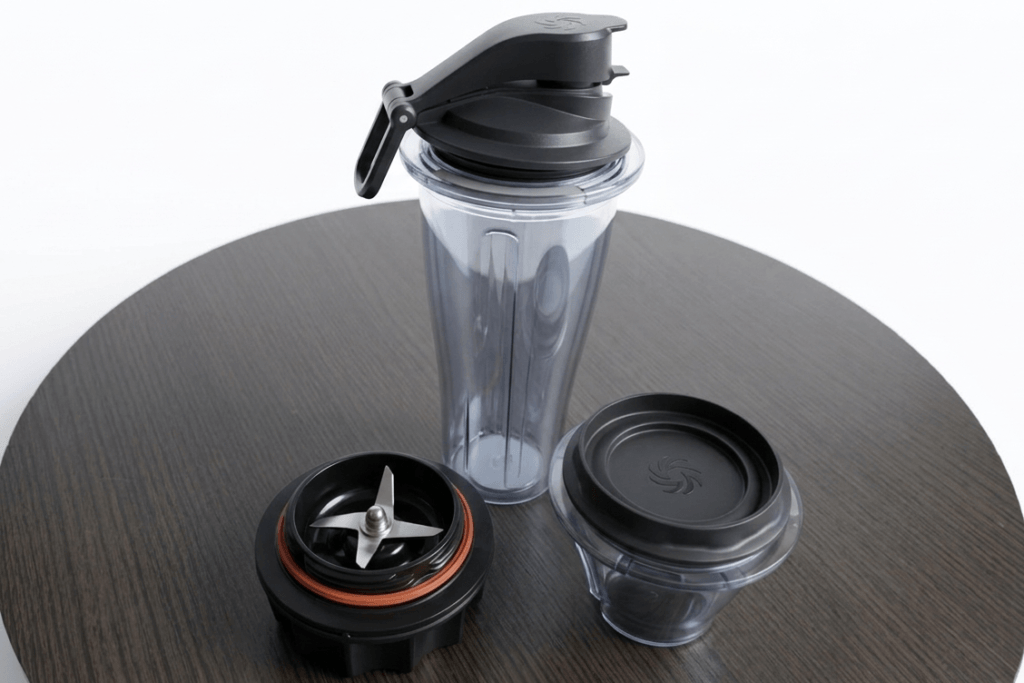 このブレンディングカップがめちゃくちゃ便利で、飲み口を付ければ作ったスムージーをVitamixに使った容器のまま飲めちゃうし、付属の蓋を付ければそのまま冷蔵庫への保存容器にもなるんです。