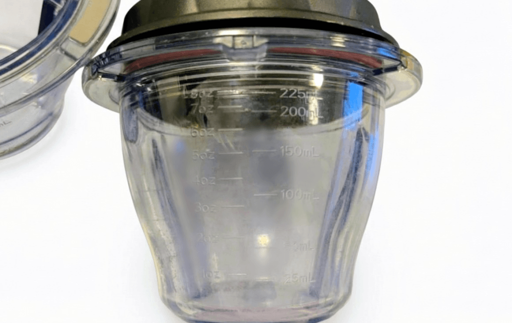 元々ついているコンテナが2リットルの大容量なのに対して、ブレンディングカップは225mlと600ml。